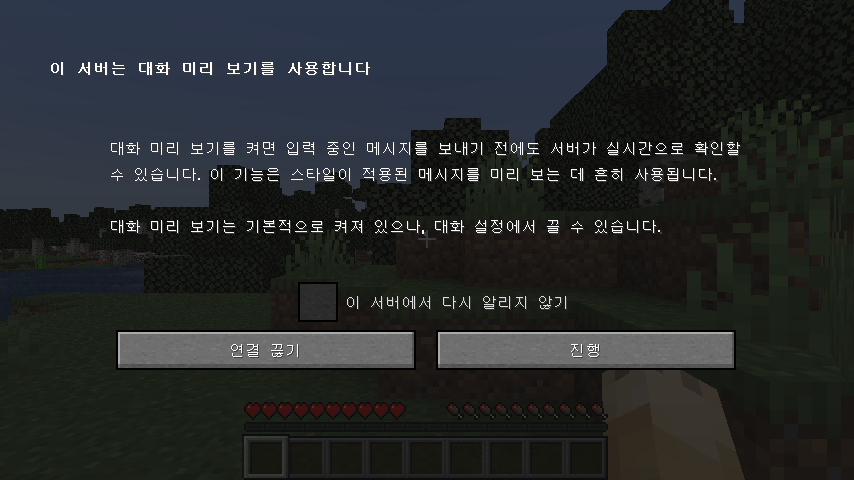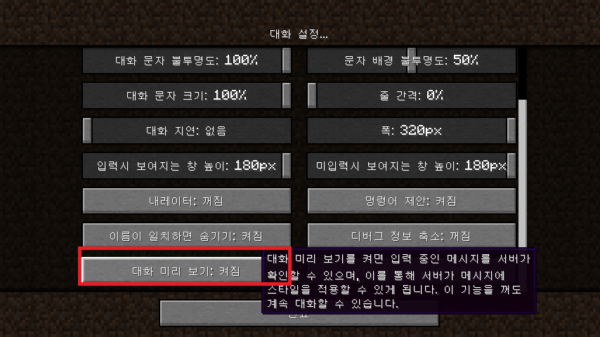서버에서 활성화 했다고해서 모든 유저가 자신의 채팅을 서버에 실시간으로 전송하지 않아도 된다는 뜻입니다. 개개인이 직접 채팅 미리보기 기능을 켜고 끌 수 있습니다.